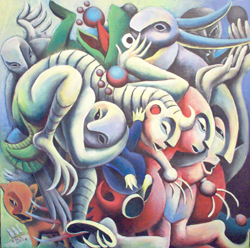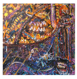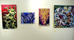 Every painting is a step in the evolution of my work. When I put brush to canvas I enjoy the anticipation of what the end result will be. The overall intent of my paintings is to expand the existing perception on the given subject whether that subject be human form, nature, mythology or an abstract thought from my own mind. This plays to the symbiotic relationship shared between the artist and his viewer. My personal goal as an artist is to push myself to create work that is unique while avoiding pretentious pitfalls. In this series I chose to interrupt a long time passion of mine, Norse Mythology, also known as Viking Mythology. Like all mythology this one, (written by warrior people), is about how mankind came to be and how it will end. The stories follow the adventures of a pantheon of gods: Odin, "King of the Gods," Loki "the Trickster," Thor "the Thunder God," Heimdall, "Centennial of the Rainbow Bridge," and many others. Their lives are chronicled until the end of their legacy when Ragnorok comes and the gods band together in one last battle against the forces of evil led by Odin's blood brother Loki. With such a rich source of material it was hard to narrow down what I wanted represented, but I tried to put a little of everything from Asgard, home of the gods, Thor's battle with giants, the apples the gods eat to stay young, to the evil ship, Naglfar, made of dead men's fingernails. I hope this work will inspire the viewer to learn more about this amazing mythology, the rich culture that spawned it, and that it evokes a sense of wonderment in a world gone by.